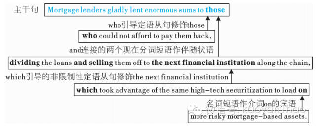 考研英语长难句练习: 【典型难句】Mortgage lenders gladly lent enormous sums to those who could not afford to pay them back, dividing the loans and selling them off to the next financial institution along the chain, which took advantage of the same high-tech securitization to load on more risky mortgage-based assets. 【结构图解】
