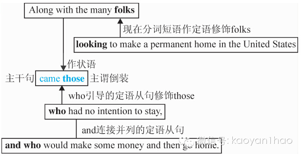 【典型难句】Along with the many folks looking to make a permanent home in the United States came those who had no intention to stay, and who would make some money and then go home.